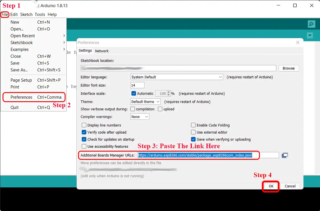 http://arduino.esp8266.com/stable/package_esp8266com_index.json in Additional Boards Manager URLs field -> OK…next in the Arduino IDE, go to: