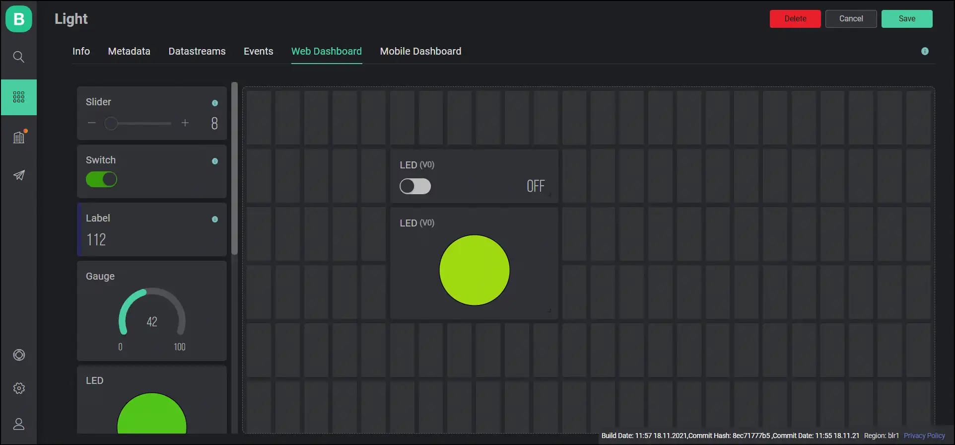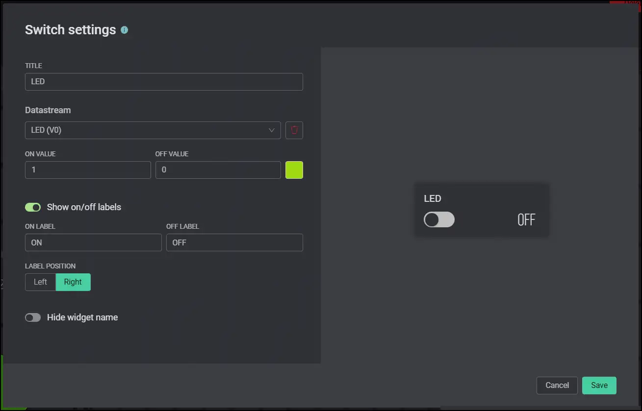 Next move on to the Web Dashboard tab, drag and drop a switch in the working area (You might also like to add an LED which will show you the current state of the actual LED). You can resize the buttons.