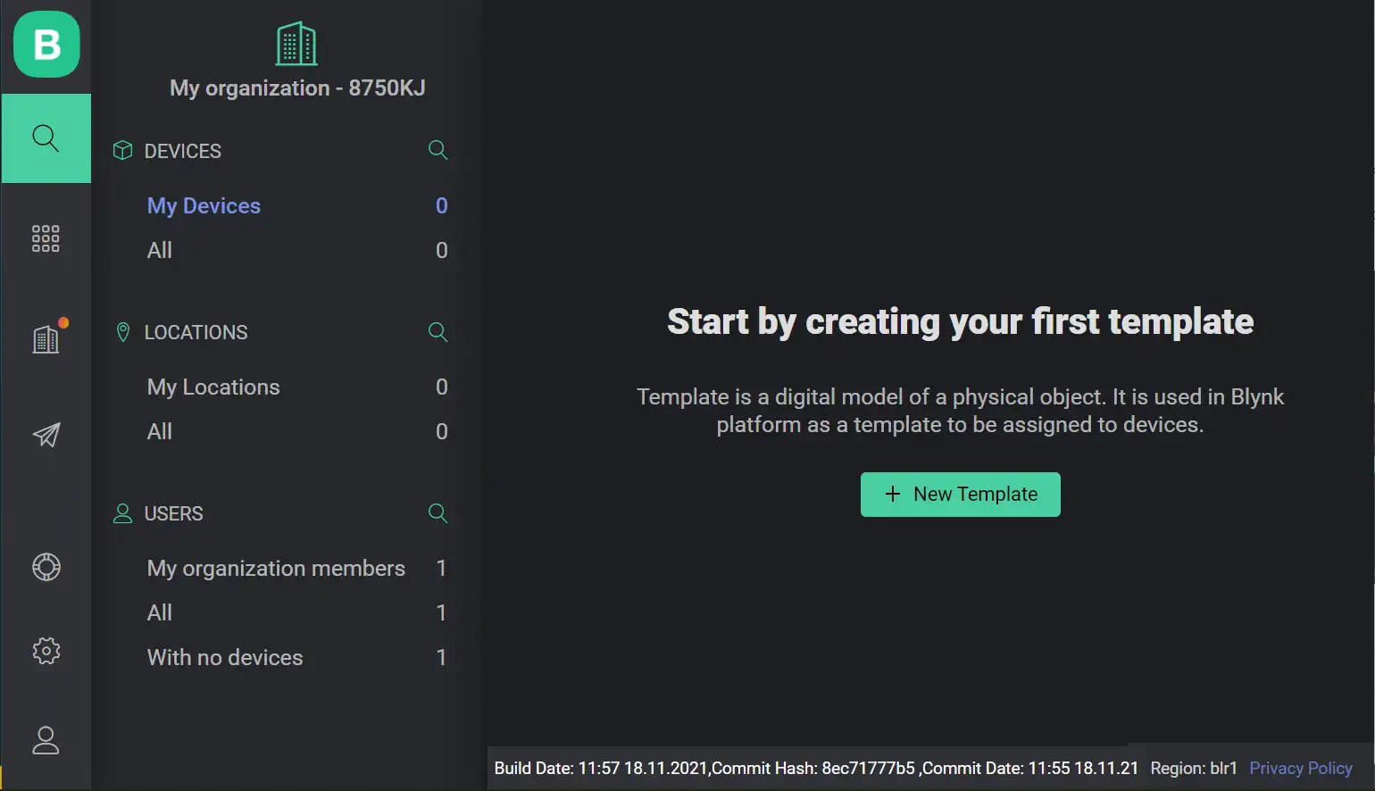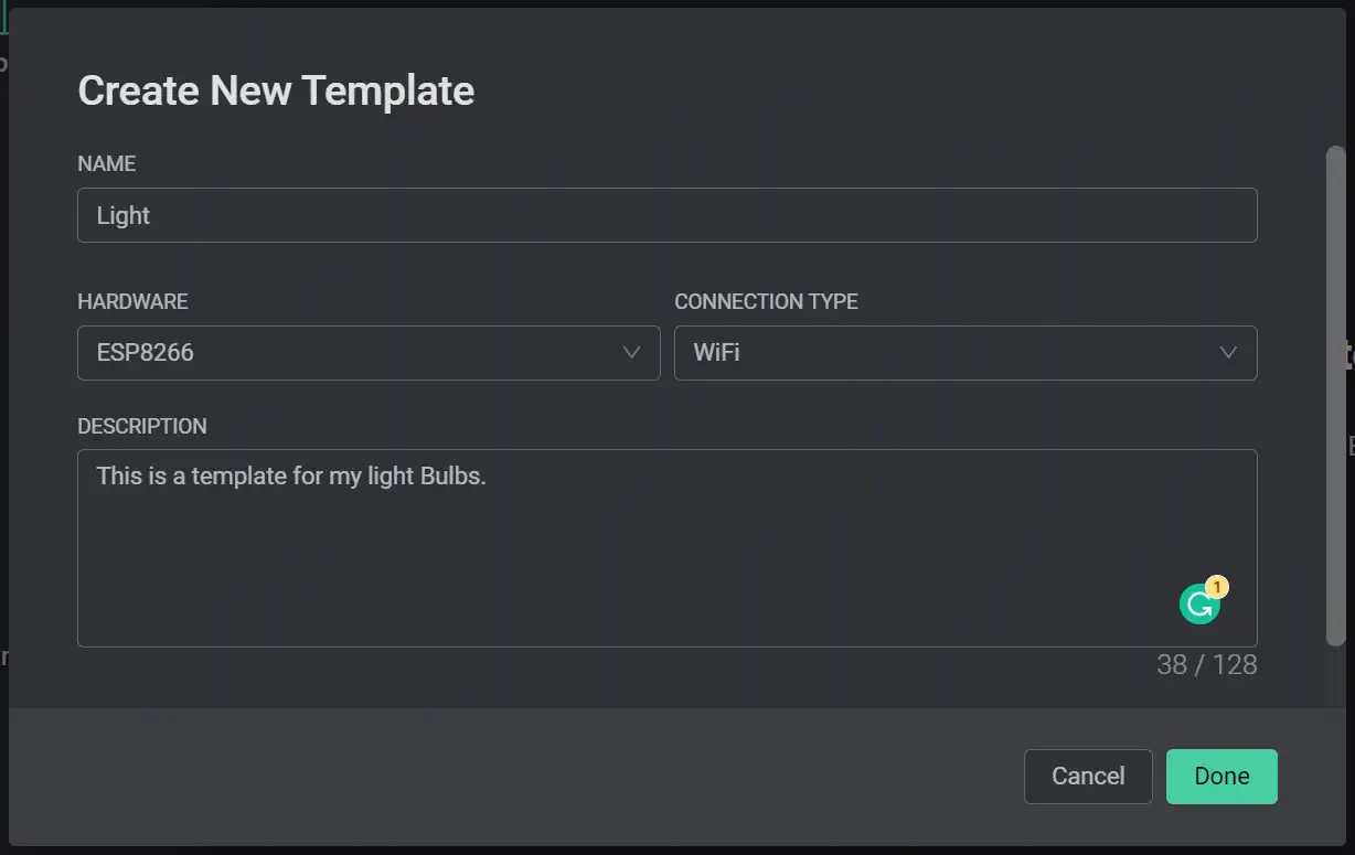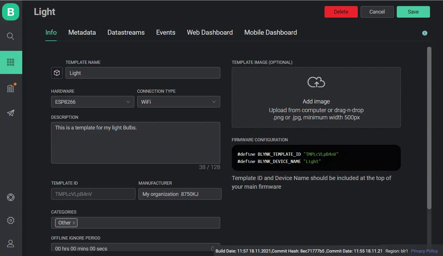 To create a template, first click on the new template button on the dashboard and fill up the form. I am using a NodeMCU which is based on the ESP8266 microchip. So, I have put “Hardware = ESP8266”.