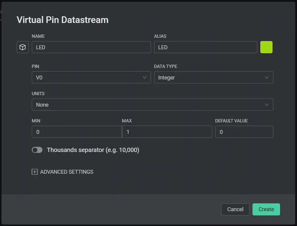 I have taken Virtual Pin V0 (available V0-V255). Here we will controll an LED by reading the value from this pin. It has only two states (i.e.: on and off). So we will set datatype as Integer and set the minimum and maximum values to be 0 and 1. Default value is your choice!